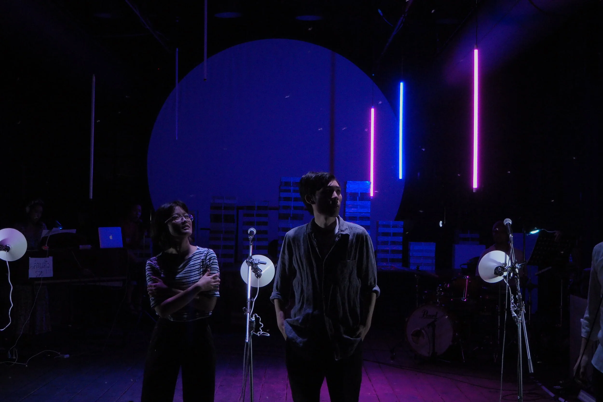 Co/exist was the first performance launched by FULLFAT Theatre company. It was premiered in 2017 at Warehouse30 and restaged in 2018 at the Bangkok Art and Cultural Centre, as part of the Bangkok International Performing Arts Meeting (BIPAM). The play was a nonlinear play performed in English with Thai surtitles. The stage was designed for the audience to see every part at all times. With the setting of a white rectangular floor and a fluorescent rectangular light-screened box above, this neutral stage setting matched the way three stories switched across each other throughout the play. I was a producer for this show and also performed a tiny part.